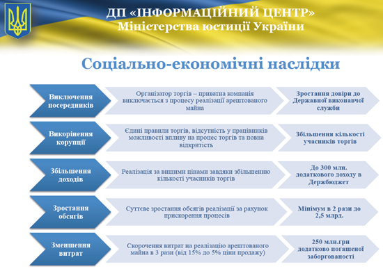 За этот период до 15 ноября 2014 года было реализовано арестованного имущества на 113 млн грн или около 5 млн евро на всю Украину. (При этом ГИС Минюста говорила о 190 млн грн до 13 ноября 2014 года.)