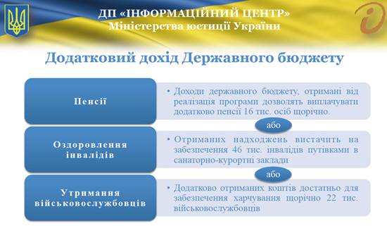 Право выбора торговца оставить за кредитором. Учет гарантийных взносов торговцев и организацию функционирования системы – за “Информюстом”. В этом случае бюджет Украины получит несколько миллиардов гривен и будет зарабатывать столько же ежегодно на налогах и исполнительном сборе.