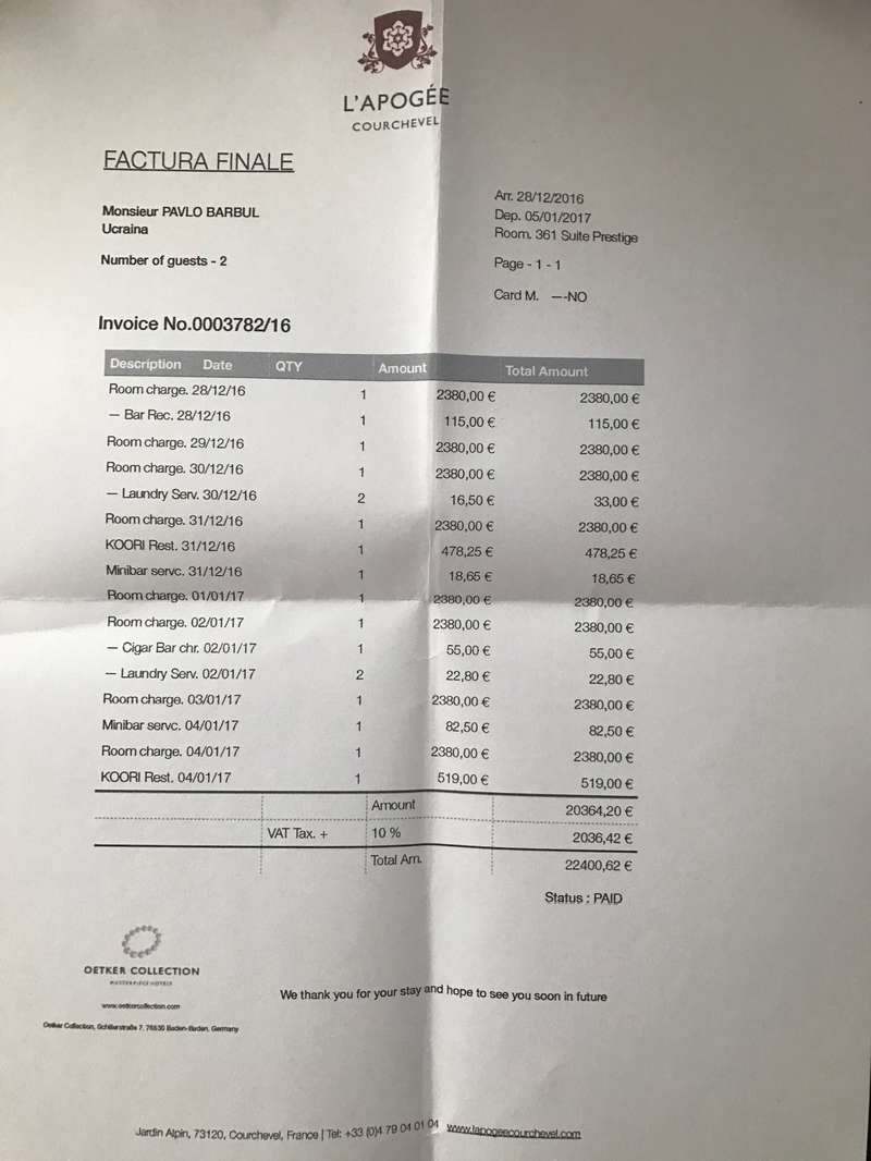 Исходя из счета от отеля L’Apogee Courhcevel 1850, Павел Барбул провел там Новогодние праздники в период с 28.12.2016 по 05.01.2017. Данный отель является самым дорогим на горе.