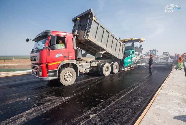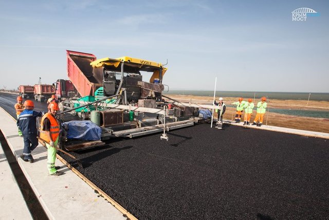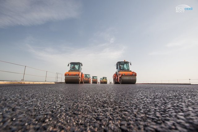 Так, в минувшие выходные, строители уложили верхний слой асфальтобетона на пилотном участке Крымского моста на острове Тузла.