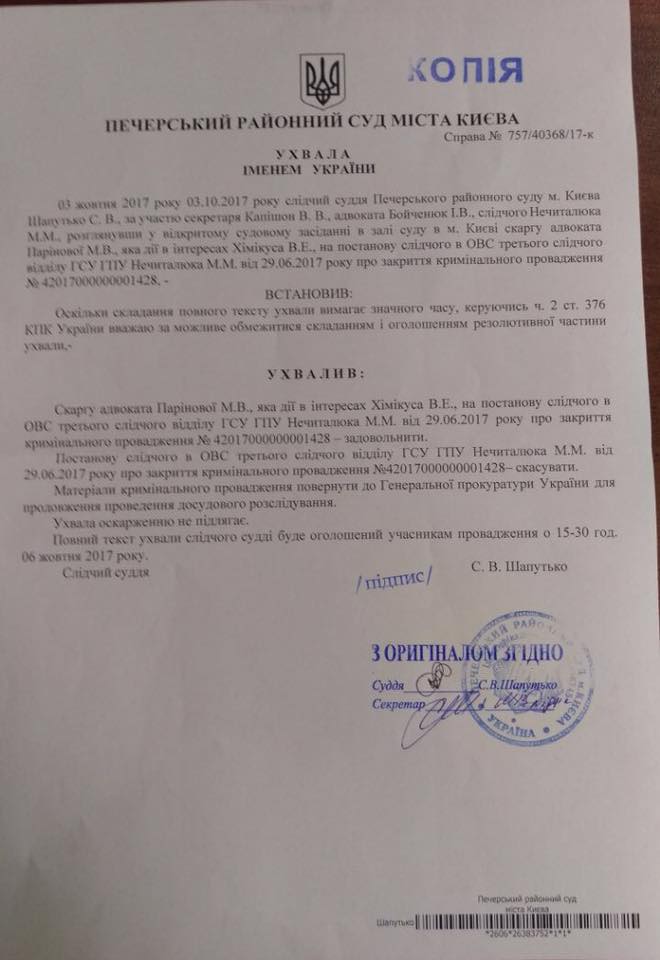 Печерский районный суд отменил постановление Генеральной прокуратуры о закрытии уголовного производства в отношении следователя прокуратуры, который закрыл дело о стрельбе народного депутата Сергея Пашинского в прохожего Вячеслава Химикуса.