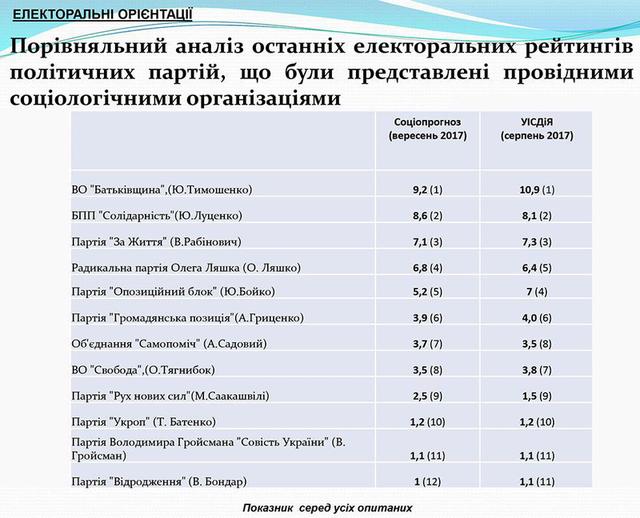 Кризисный мониторинг», интересуясь, в частности, и электоральными настроениями граждан страны. Результаты социсследования были представлены 3 октября 2017 года в пресс-центре Национального союза журналистов Украины в Киеве.