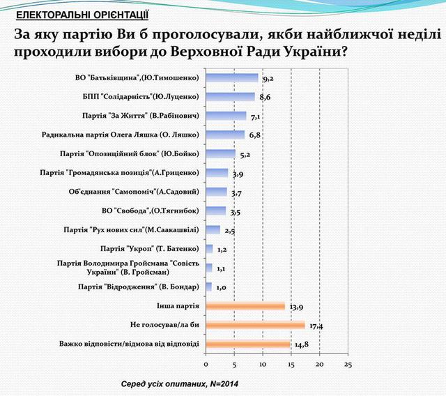 Теги: Рух новых силГражданская позиция ГриценкаВО СвободаТягныбокОлег ЛяшкоПартия За життяРабинович ВадимБойко ЮрийОппозиционный блокСаакашвили МихаилТимошенко ЮлияВО БатькивщинаРейтингПартииСоцопрос
