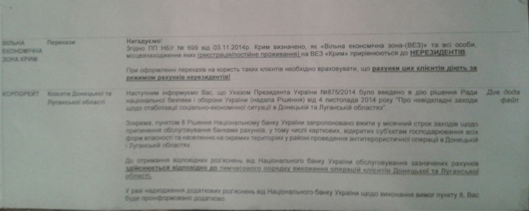В моем распоряжении оказались те самые расшифровки директив Нацбанка, которые были спущены украинским банкам сверху. Так вот, в них черным по белому прописано, что все банковские счета в донецком Славянске и луганском Северодонецке должны перестать обслуживаться с 19 декабря текущего года. Как известно, оба этих города уже давно и долго относятся к числу освобожденных и находятся под полным контролем Украины.