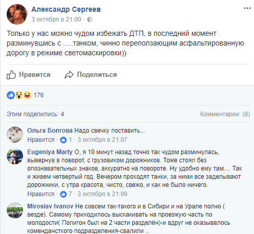 "Только у нас можно чудом избежать ДТП, в последний момент разминувшись с танком, чинно переползающим асфальтированную дорогу в режиме светомаскировки", – пишет экс-главарь "ДНР".