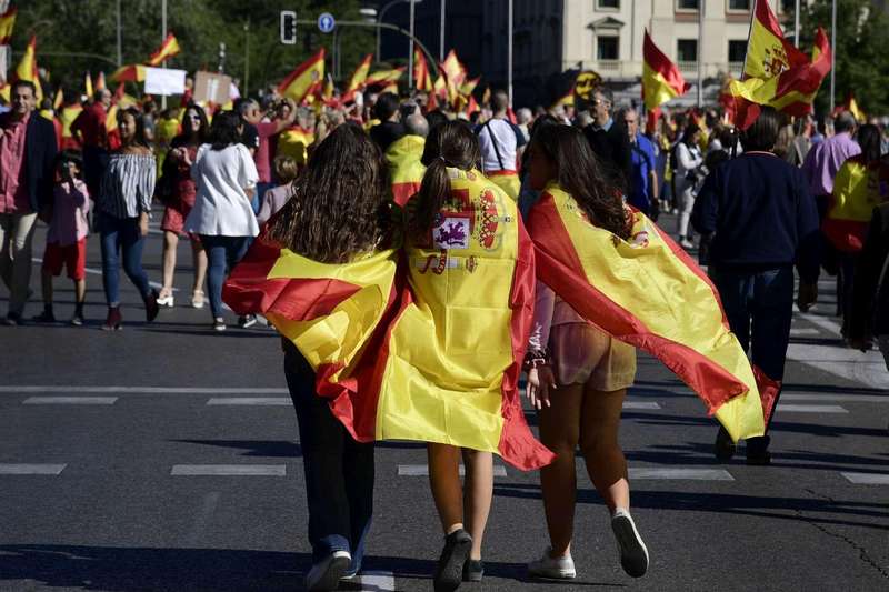 На мадридской площади Пласа де Колон собираются сотни тысяч граждан, которые держат в руках национальные флаги и плакаты с призывом не допустить раскола Испании.