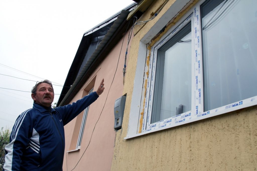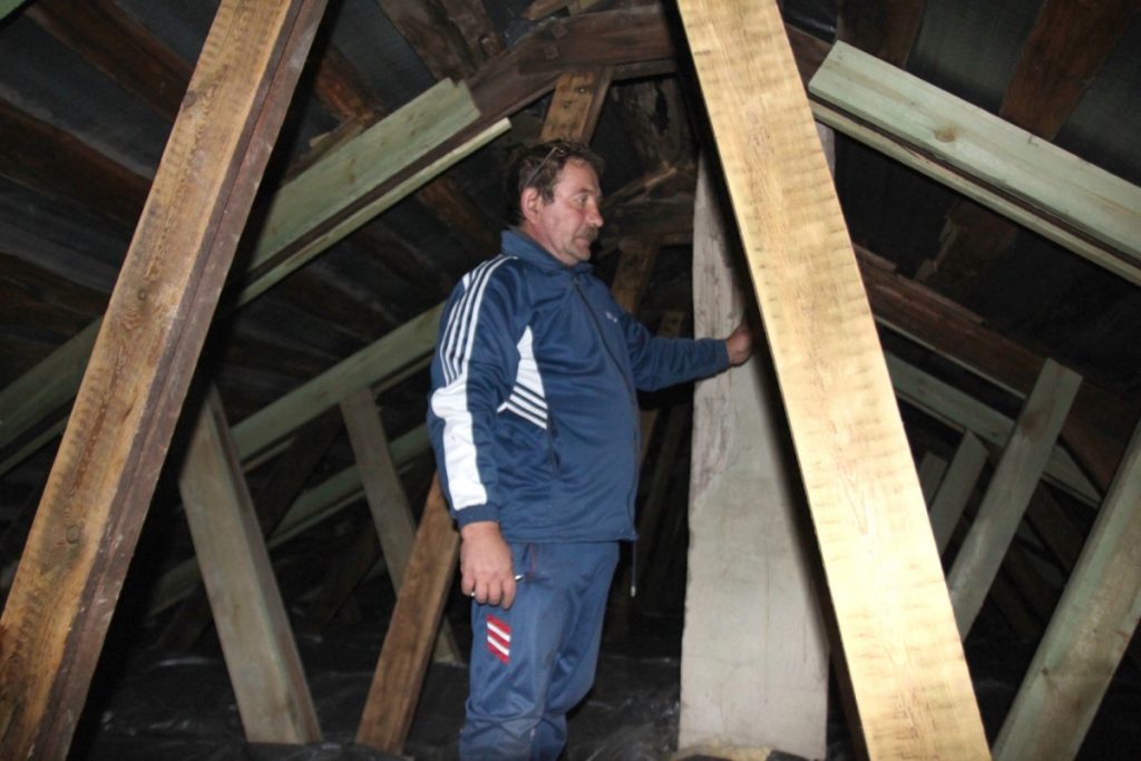 "Ужасная работа, – говорит он. – Когда они там клали листы, строитель провалился в хату. Вот здесь у меня стена отошла, поставили три скобы, которые продержатся не больше пяти лет, и потолок опять обвалится. Поэтому приходится самому укреплять".