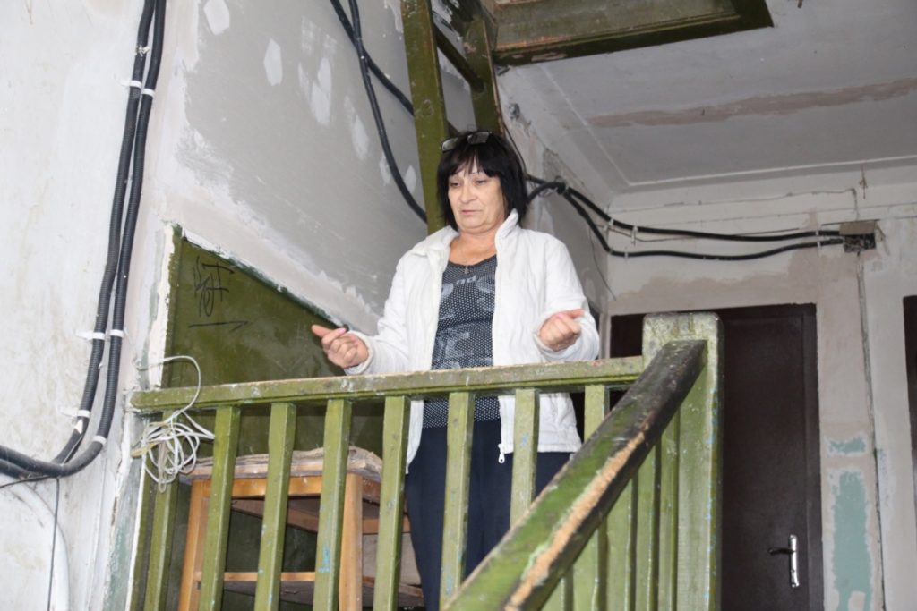 Жительница микрорайона Нефтяник в Балаклее Зинаида Лапутина ведет к себе в квартиру. По пути с сарказмом повторяет слова строителей: "Мы для вас конфетку сделали".