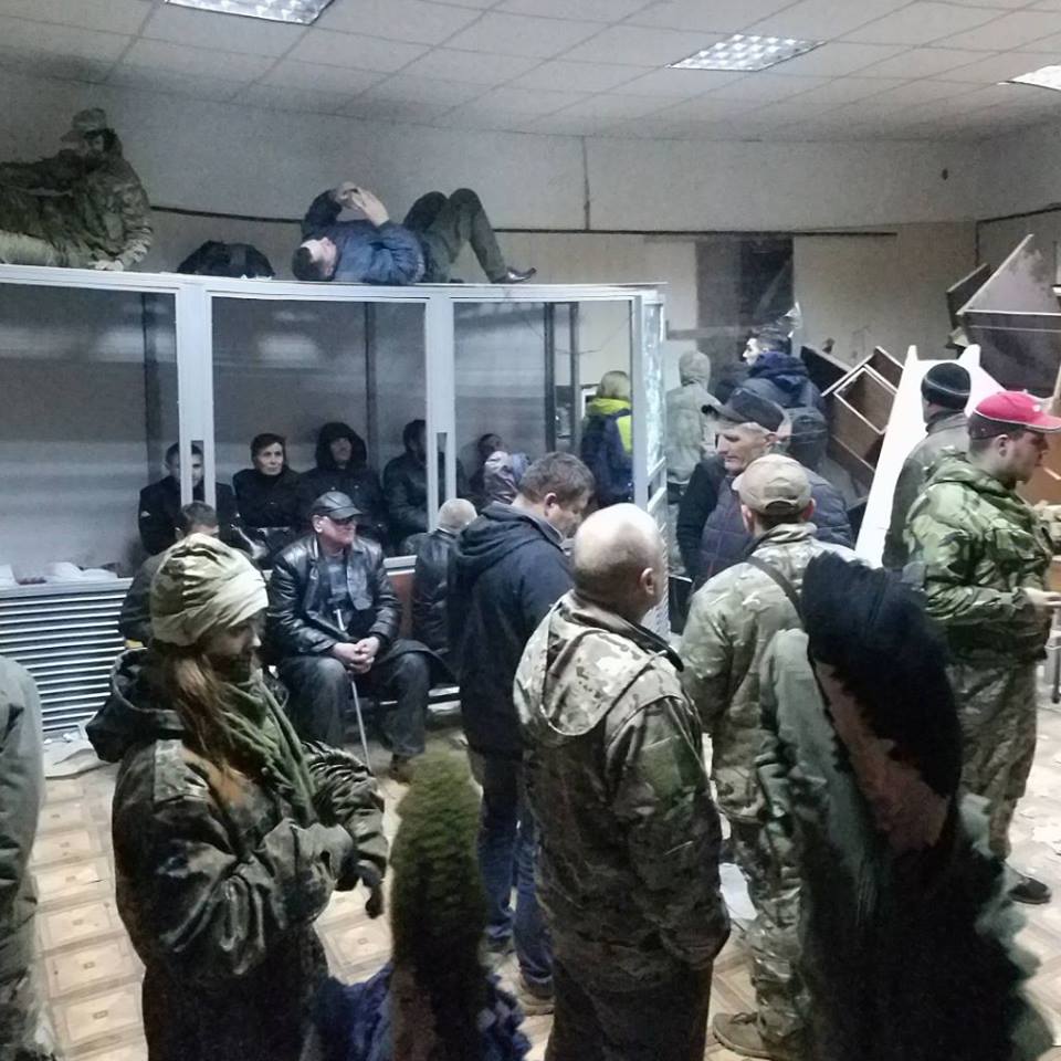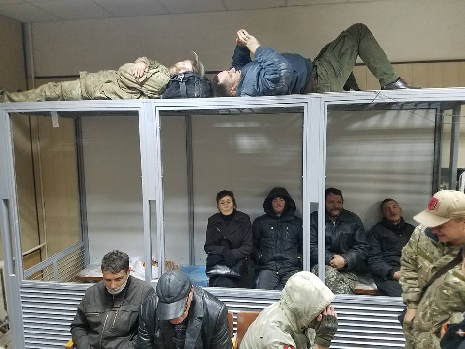 Активисты и соратники лидера «Добровольческого движения ОУН» Николая Коханивского забаррикадировались в зале Святошинского райсуда, ждут утреннего заседания.