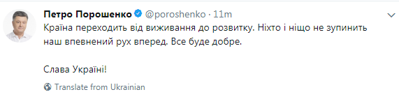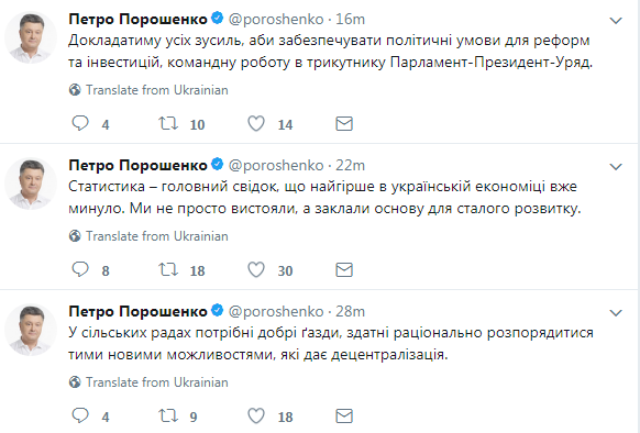 "За три года ее внедрения доходы местных бюджетов выросли примерно в 2,5 раза. Статистика - главный свидетель, что худшее в украинской экономике уже прошло. Мы не просто выстояли, а заложили основу для устойчивого развития. Прилагаю все усилия, чтобы обеспечивать политические условия для реформ и инвестиций, командную работу в треугольнике Парламент-президент-правительство. Страна переходит от выживания к развитию. Никто и ничто не остановит наш уверенное движение вперед. Все будет хорошо", - подчеркнул Порошенко.