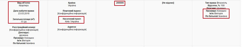 Среди недвижимого имущества в собственности Анны Григорьевны находится квартира площадью 76 м² в Киеве, по адресу ул. Закревского, 95-Г. По нашей информации, ранее этой квартирой владел лично прокурор Владимир Комашко. Стоимость подобного жилья сегодня — ок. 65 тыс. долл.