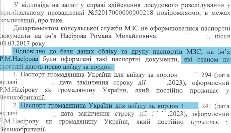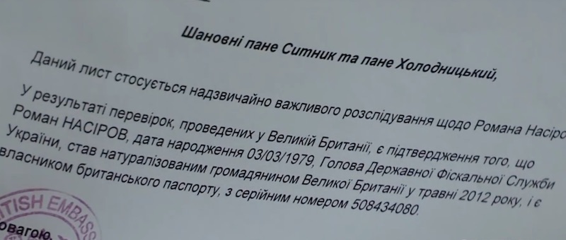 Назар Холодницкий, руководитель специализированной антикоррупционной прокуратуры (САП), подтвердил, что британская сторона предоставила информацию о том, что Насиров действительно обращался с ходатайством, и ему действительно выдавался паспорт подданного Ее Величества.