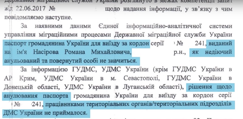 На этом история с паспортами не заканчивается. Детективы обнаружили, что Насиров не сдал еще и второй заграничный паспорт. На заседании 8 июня адвокаты подозреваемого утверждали, что второй паспорт уже недействителен, так как его аннулировал сотрудник Государственной миграционной службы «путем пробивания более двух разворотов в машиносчитываемой зоне». Но похоже, судья официально в недействительности паспорта не убедилась и поверила защите. Уже после вынесения этого решения выяснилось, что этот паспорт Насирова миграционной службой не аннулировался. Ниже – письмо миграционной службы в адрес НАБУ, который предоставили на запрос журналистов.