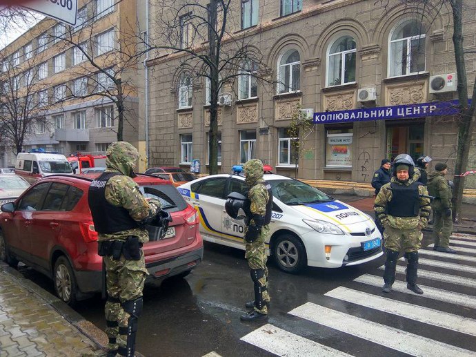 «Здание полностью окружено и заблокировано полицейскими. Стоит национальная полиция, стоит какое-то спецподразделение не идентифицированное, стоит реанимации машина. Перекрыты и перетянуты лентами тротуар и дорога», — сказал Рысенко.