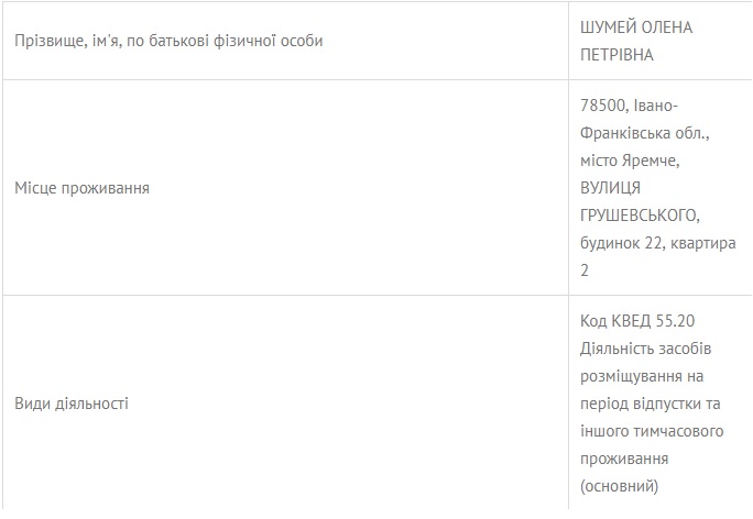 Нагадуємо, що жодних відомостей про доходи, отримані від ведення бізнесу чи здачі майна в оренду, в деклараціях прокурора та його дружини – немає. Та й бізнес державні службовці не мають права вести. Єдиним членом родини, зареєстрованим як фізична-особа підприємець, є теща прокурора – Шумей Олена Петрівна. Вона має і відповідний КВЕД – «дiяльнiсть засобів розмiщування на перiод вiдпустки та іншого тимчасового проживання», зареєстрований за адресою одного із будинків прокурора.