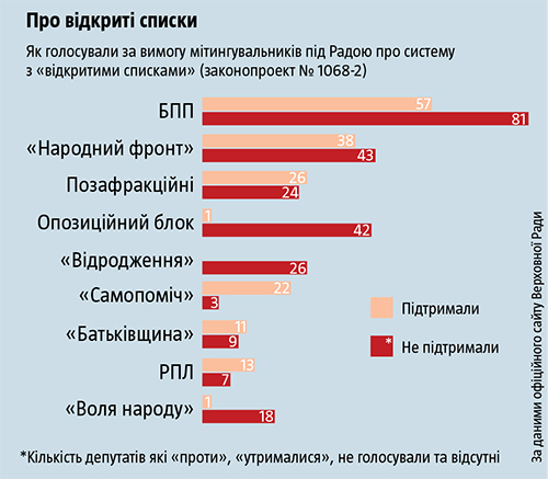 Голосование в парламенте за проект изменений в избирательную систему Чумака в целом отражает интересы сторон. Например, голосовали «за» большинство членов фракции БПП и «Народного фронта». Проигнорировала голосования почти половина внефракционных депутатов, а составленные из мажоритарщиков группы «Возрождение» и «Воля народа» дали аж один голос. Однако есть те вещи, которые сложно объяснить логикой. Например, речь идет о голосовании фракции Оппозиционного блока. Моделирование показывает, что в случае введения системы с открытыми списками эта партия может увеличить количество депутатов почти вдвое, однако за проект проголосовал лишь один ее член. Так же не дали стопроцентных показателей поддержки фракции РПЛ и «Батькивщины», которым тоже должно быть выгодно изменение системы (см. «Если бы завтра состоялись выборы ... Нынешняя модель» и «Если бы завтра состоялись выборы ... Модель, предложенная «кодексом Парубия»).