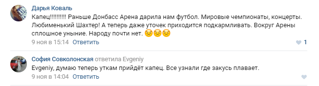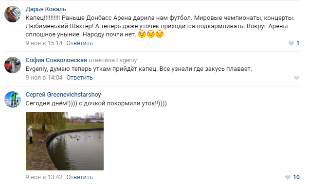 "Раньше Донбасс Арена дарила нам футбол. Мировые чемпионаты, концерты. Любименький Шахтер! А теперь даже уточек приходится подкармливать. Вокруг Арены сплошное уныние. Народу почти нет", " "Я думал их ДНЭРЫ уже сожрали", - пишут в комментариях к снимкам.