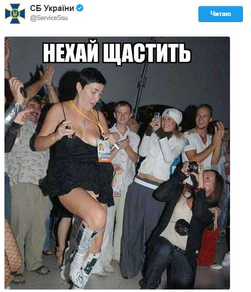 За короткое время эта история получила широкую огласку. И хотя Лолита сделала попытку номер два, покритиковав советника главы МВД Антона Геращенко (тот, напомним, виделся ей сотрудником ФСБ, неизвестно почему), она стала мемом. Подлила масла в огонь именно СБУ - красноречивые коллажи с надписью "Нехай щастить" оценили все. И поняли именно так, как нужно.