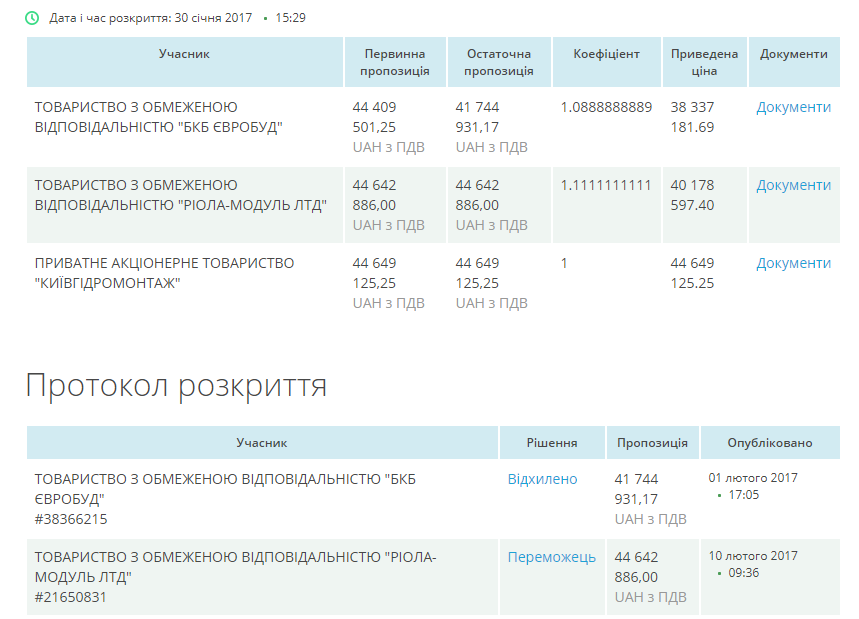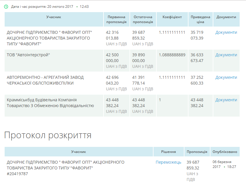 И, наконец, в декабре прошлого года торги объявляют в третий раз - опять свои предложения подали четыре компании, победителем стала все та же житомирская фирма "Фаворит опт", обещая выполнить ремонт за почти 40 миллионов гривен.
