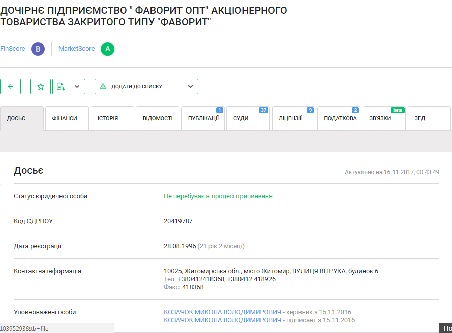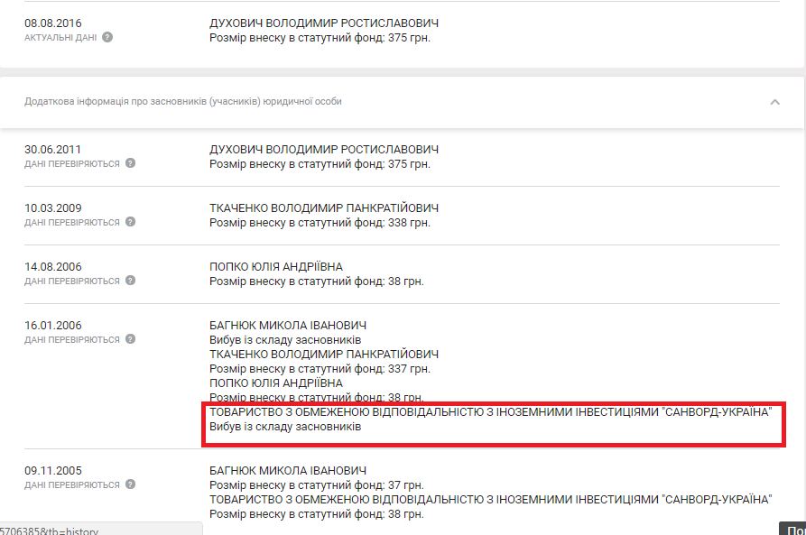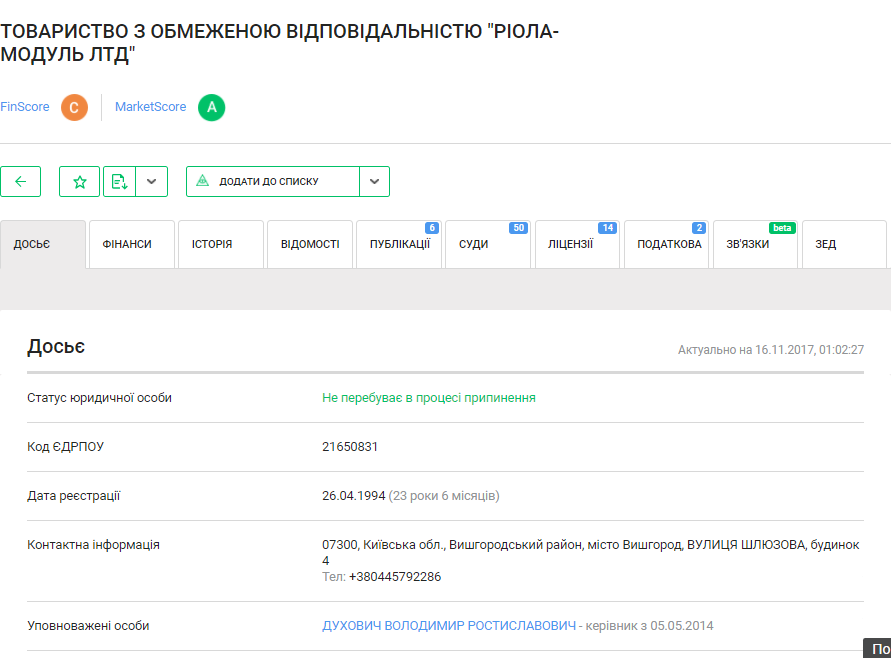 Компания "Риола-модуль лтд", на данный момент зарегистрированная в городе Вышгород Киевской области, имеет уставной капитал всего 375 гривен. До 2006 года в состав учредителей входило ООО с иностранными инвестициями "Санворд-Украина".