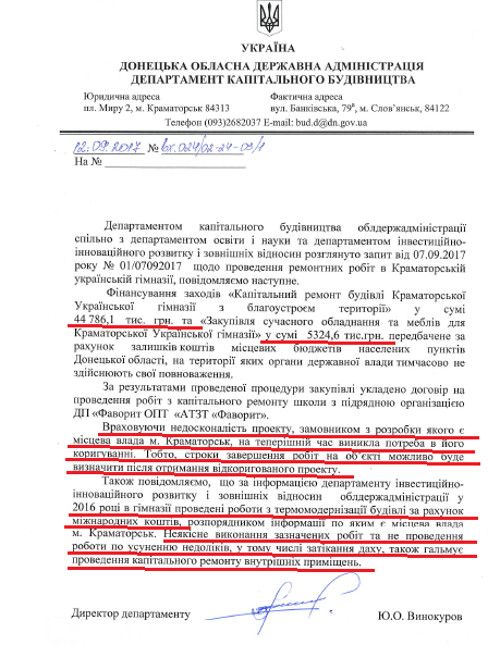 Отправив запрос в управление капитального строительства Донецкой областной военно-гражданской администрации, мы выяснили, что на капитальный ремонт здания Краматорской украинской гимназии было выделено 44,786 миллионов гривен, а на закупку мебели и оборудования - более 5,3 миллионов гривен. Тендер провели, деньги направили, а в разгар ремонта оказалось, что проект работ выполнен некачественно, и только теперь его будут корректировать. Когда ремонт в учебном заведении завершится, чиновники не в курсе.
