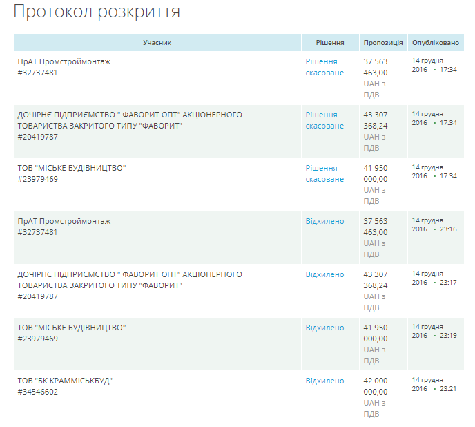 Но вернемся к капитальному ремонту краматорской гимназии. Тендер на проведение работ, которые включают в себя не только ремонт здания, но и благоустройство прилегающей территории, объявлялся профильным департаментом трижды - два раза торги не состоялись, информацию об этом можно найти в системе "Прозорро". Первый раз тендер был объявлен еще в сентябре 2016 года. Тогда на торги подалась компания дочернее предприятие "Фаворит опт" ЗАО "Фаворит" с предложением сделать работы за 41 миллион гривен. Тендер отменили из-за того, что больше желающих выполнять ремонт не нашлось.