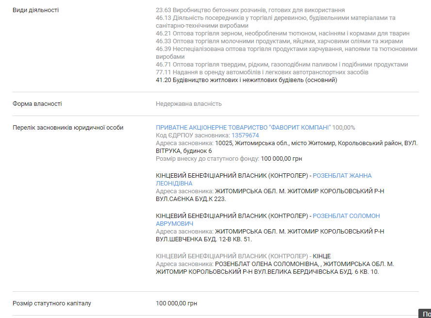Так, согласно аналитической системе YouControl, конечными бенефициарами дочернего предприятия "Фаворит опт" значатся возможные родственники скандального нардепа - Жанна и Соломон Розенблаты (в э-декларации депутата Жанна Леонидовна Розенблат указана как жена, а Борислав Розенблат имеет отчество Соломон). Уставной капитал житомирской фирмы, выигравшей десятки миллионов бюджетных средств, всего 100 тысяч гривен. При этом ремонт гимназии в Краматорске - не единственный выигранный компанией тендер: возможно, помогают влиятельные связи?