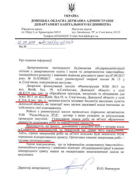 Как сообщили чиновники в официальном ответе на запрос, на реконструкцию славянской школы было выделено 46,415 миллионов гривен, более 6 миллионов планируют потратить на мебель и оборудование. В то же время в департаменте капстроительства признают - темпы выполнения работ замедленны. Но, как и в случае с ремонтом краматорской гимназии, виноваты в затягивании работ, по мнению Ю. Винокурова, местные власти, которые проплатили разработку проекта.