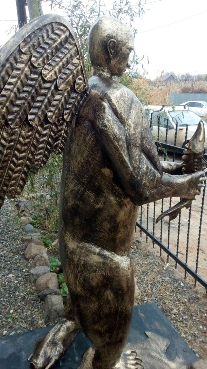 Астраханец Виктор Кропачев создал кованую скульптуру «Ум, сила и душа», в которой изобразил медведя с крыльями и головой президента России Владимира Путина, держащего осетра.