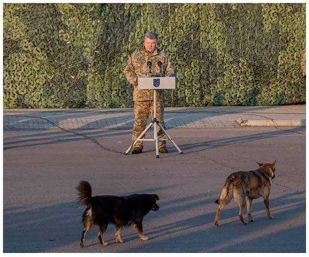 Пользователь Facebook Елена Скидан также опубликовала фотографию Порошенко с собаками на плацу.