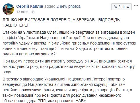 Каплин, в связи с ответом Украинской Национальной Лотереи повторно обратился к Нацагентству по предупреждению коррупции, чтобы там немедленно, учитывая факты, взялись проверять декларацию Ляшко, а также сообщили о новых фактах для расследования незаконного обогащения лидера РПЛ, которое проводит НАБУ.