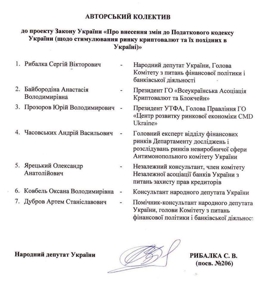 Среди авторов законопроекта Рыбалки Анастасия Байбородина числиться как президент ОО "Всеукраинская Ассоциация криптовалюта и Блокчейн".