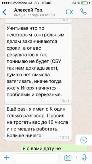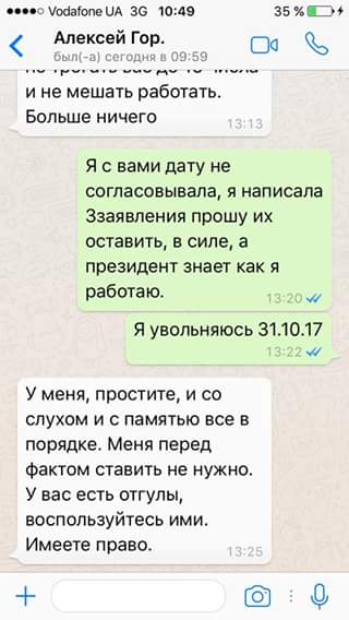 В сообщениях, Горащенков пишет Соломатиний, что должен был доложить президенту о ее увольнении. Также он отметил, что по некоторым делам заканчиваются сроки, а от нее, Соломатиной, он не ожидает результат, потому что "так докладывает СБУ".