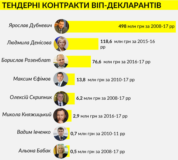Задекларовані фірми восьми депутатів отримали тендерні контракти на суму понад 700 млн грн. При цьому більшість цих грошей припадає на депутатів президентської фракції. Підприємства із декларації Ярослава Дубневича з 2008 року "натендерили" 0,5 млрд грн, з яких 200 млн грн — протягом 2014-2017 років.
