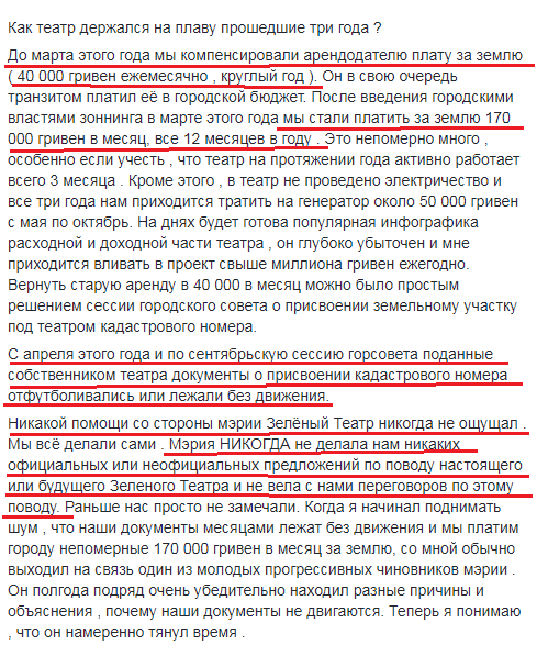 В частности, Егор Гребенников написал на своей странице в фейсбуке, что до марта 2017 года арендная плата за землю под Зеленым театром составляла 40 тысяч гривен ежемесячно в течение целого года.