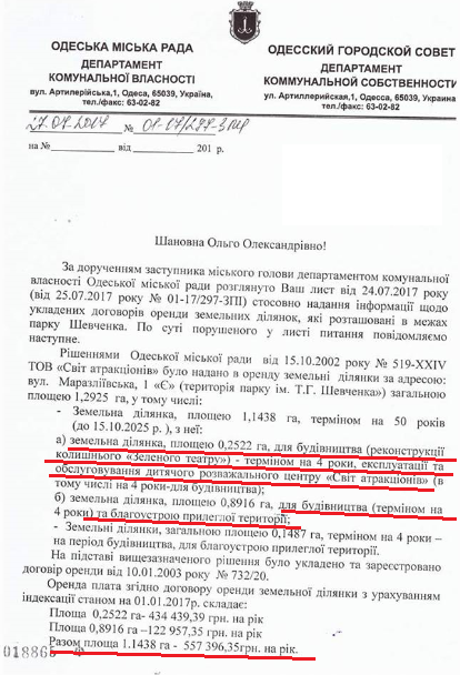 Отправив запрос в департамент коммунальной собственности Одесского горсовета, нам удалось выяснить, какие компании арендуют элитную землю парка Шевченко, включая Зеленый театр.