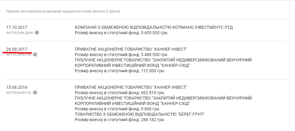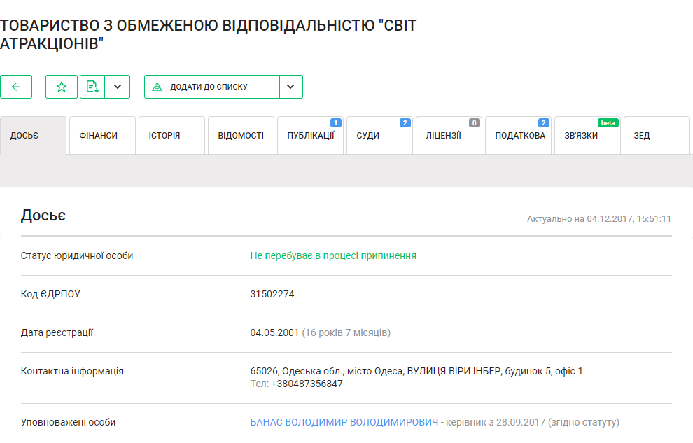 Если обратиться к истории компании "Мир аттракционов", то ранее предприятие принадлежало нынешнему заместителю главы Одесского облсовета, представителю партии "Батькивщина" Олегу Радковскому - так, вплоть до сентября 2017 года в учредителях фирмы значились связанные с политиком ПАО "Ханнер инвест" и "Закрытый недиверсифицированный венчурный корпоративный инвестиционный фонд "Ханнер-восток". Но осенью в учредители зашел кипрский офшор, что может указывать на смену реального собственника ООО "Мир аттракционов".