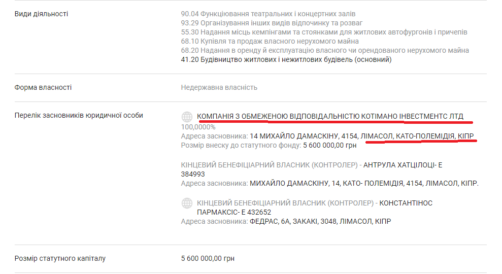 Согласно аналитической системе YouControl, ООО "Мир аттракционов", созданное в далеком 2001 году (очевидно, под готовящуюся аренду ценной одесской земли, ведь тогда в основателях фирмы был и Игорь Боделан - родственник городского головы Одессы Руслана Боделана), специализируется на строительстве жилых и нежилых зданий. На данный момент официально принадлежит компания двум киприотам, а в учредителях - кипрский офшор, созданный всего полгода назад и скрывающий истинных собственников одесской фирмы, планирующей застроить парк Шевченко и Зеленый театр.
