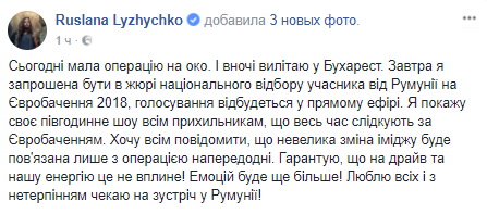 "Сегодня имела операцию на глаз. И ночью вылетаю в Бухарест. Завтра я приглашена быть в жюри национального отбора участника от Румынии на Евровидение 2018, голосование состоится в прямом эфире", – сообщила Руслана.