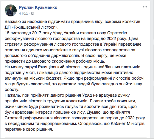 “Данная стратегия реформирования лесного хозяйства в Украине предусматривает создание единого монополиста в области лесного хозяйства посредством объединения гослесхозов. В свою очередь, это может привести к массовому сокращению рабочих мест. Если при реформировании лесхозов рабочие места будут сокращены, то десяткам людей будет сложно найти другую работу”, - пишет он.