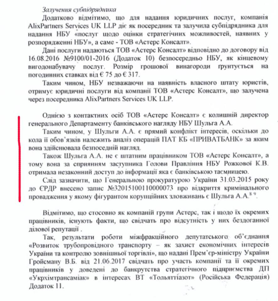 «Шульга А.А. не є штатним працівників ТОВ «Астерс Консалт», а тому вона за сприяння заступника голови правління НБУ Рожкової К.В. отримала незаконний доступ до інформації, яка є банківською таємницею».
