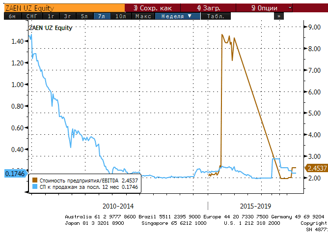 Сейчас Ev/S компании около 0,2. Исторически уровень достигал значений 1,4 (это видно на вытяжке из Блумберга ниже), что при чистом долге 2 млрд могло дать оценку в районе 1600 грн. при выручке 16 млрд грн и 2050 грн при выручке 20 млрд грн. Даже если взять среднее значение мультипликатора за этот период, то мы получим оценку 850 и 1100 грн соответственно.