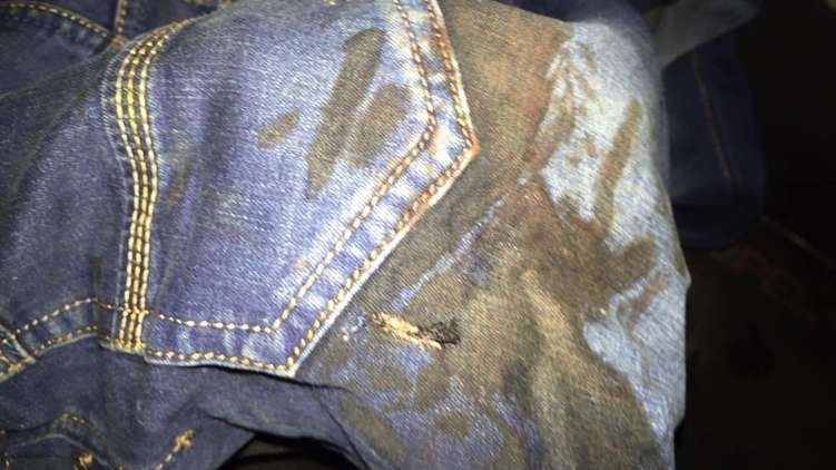 Окровавленные джинсы Химикуса с отверстием от пули. Фото: "Страна"