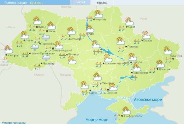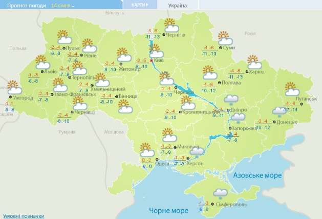 В воскресенье, 14 января, снег ожидается в ряде восточных областей, в Херсонской области и в Крыму. Температура воздуха на западе составит -2…-4 днем и -7…-9 ночью. В центральных областях -2…-4 днем и -8…-10 градусов ночью. На севере днем -4…-6, ночью -11…-13 градусов. На востоке -4…-6 днем и -12…-14 градусов ночью. В южных областях и Крыму -1…-3 днем и до -7…-9 ночью.