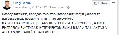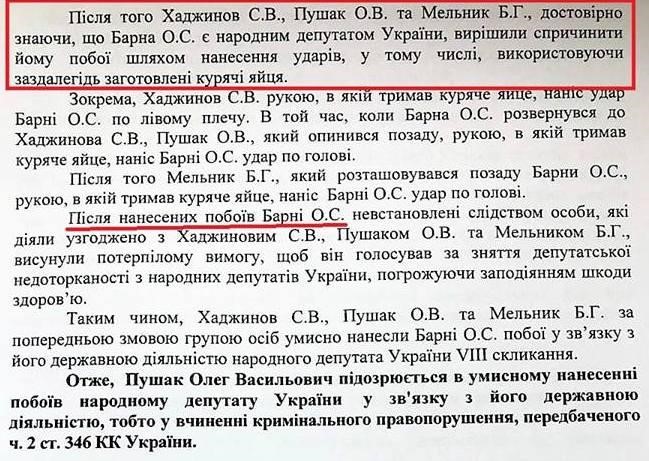 «13 июля 2017 г. у нас была акция: требовали от ВР снять неприкосновенность с ряда депутатов, среди которых были Добкин и Розенблат, — рассказал об инциденте один из подозреваемых в совершении «нападения» на Барну — Олег Пушак. - Во время акции к нам подошел депутат Олег Барна. Провоцировал, ругался — называл нас не народом Украины, из-за чего и полетели яйца…».