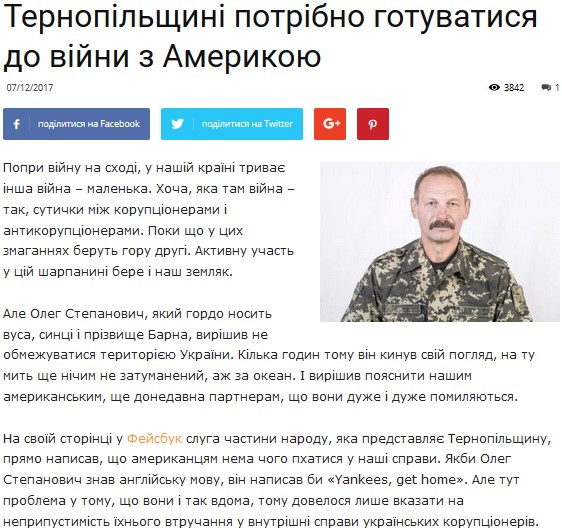 Особенно после того, как Олег Барна у себя в Фейсбуке «объявил войну» американцам. Мол, такие-сякие — не только дают Украине деньги, но еще и суют нос в дела украинских коррупционеров, а должны только давать. После этой публикации https://www.facebook.com/Oleg.Barna.Official/posts/919373418220710 тернопольчане начали шутить на тему необходимости запасаться солью и спичками из-за Барны.