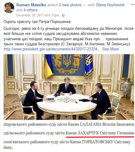 В четырехлетнюю годовщину поездки к Межигорью автомайдановцы не только проведали главу ГПУ. Они подвели неутешительные итоги. Ни один из 120 судей, выносивший политически мотивированные решения по майдановцам, не наказан. Хотя существуют сотни уголовных производств и были подготовлены 48 обвинительных актов. Которые, увы, не имели шанса реализоваться из-за саботажа тех, кто над ними работал (и активисты обвиняют в этом лично Юрия Витальевича).