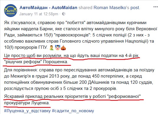 Права одного депутата Барны заботят ГПУ гораздо больше прав 450 автомайдановцев, которых преследовали за Межигорье: «делом яичных террористов» занимаются 15 правоохранителей, а всеми делами, связанными с незаконным преследованием майдановцев — семеро полицейских и прокуроров.