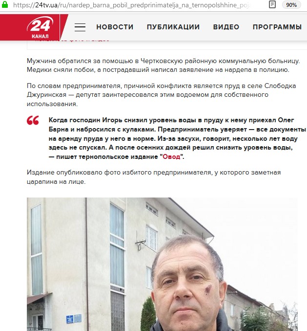 Вот и в качестве народного депутата остается зачинщиком потасовок. Уже будучи представителем законодательной власти, Барна сломал ребро коллеге «радикалу» Юрию Чижмарю и избил тернопольского предпринимателя Игоря Мизерота. Депутаты между собой договорятся, а фермер уверен, что Барне все сойдет с рук: «Барна использует все возможности, законные и незаконные, чтобы забрать у меня пруд. Я понимаю, что ему ничего не будет, он в центре Киева сбил трамвай и это ему простили».