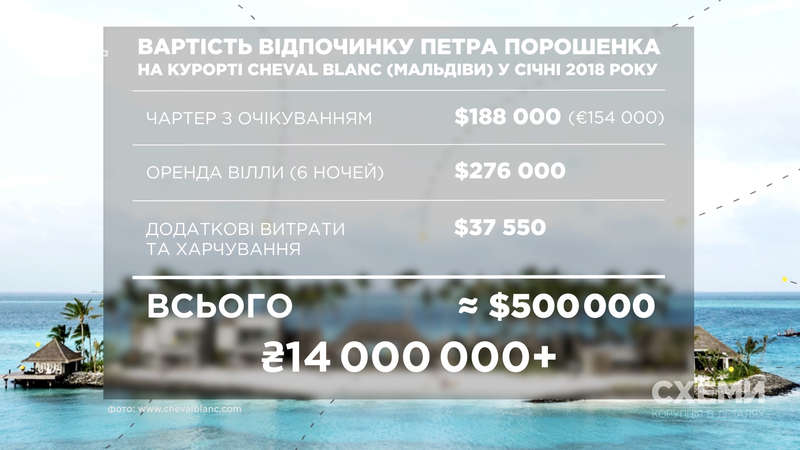 Отдых президента Украины Петра Порошенко на Мальдивских островах в пятизвездочном курортном отеле стоил не менее $500 тыс. (более 14 млн грн), говорится в расследовании журналистов программы Схемы.